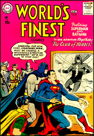 Abruptly, though, Superman was laid low by a mysterious illness reminiscent of kryptonite poisoning and a new hero named Lightning-Man, clad in an orange costume with a purple cape and cowl, came on the scene. Even as Lightning-Man's displays of heroism racked up, from dispersing a tornado to preventing an airplane crash, Superman and Batman suspected the worst. They feared the new crime buster wanted to claim the chairmanship of the Club and the property for himself.