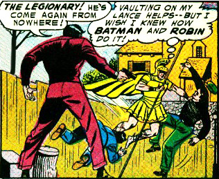Batman had been suspicious from the start and allowed the Legionary to take the lead in the investigation. As a precaution, the Dark Knight threw his batarang into the supposed hideout . When it exploded, he allowed Robin and the others to believe him dead until he could draw Cardine's gang into the open. "Knots" had kept his mob abreast of the heroes' plans thanks to "a walkie-talkie mike inside his helmet, with his spear for an aerial".