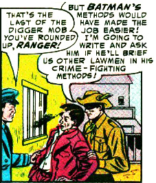 The gang managed to escape and, incredibly, evaded multiple roadblocks. Only the Legionary seemed to have spotted anything a distinctive series of scratches on the side of the getaway car, "as though by bushes so their hideout must be in a thickly-wooded country region." The fact that Batman had missed the clue and seemed to be at a loss to explain Cardine's getaway shook the confidence of the other Batmen, but they kept their opinions to themselves.