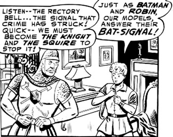 The Knight and Squire made their home in an English village known as Wordenshire. They were a father and son team who by day were the Earl of Wordenshire and young Cyril. The Knight was clad in gold armor and chain mail while the Squire wore a matching tunic and archer's cap. Inspired by the story of the Bat-Signal, the duo arranged for the townspeople to sound the rectory bell whenever they were needed. These modern cavaliers rode into battle on unique motorcycles with horse's heads mounted on the front their war horses.