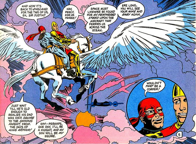 Eventually, Percy donned a chain mail armor and red bandana mask to become the Squire. In 1942 he joined three other young heroes to form the Allies. The Allies accompanied the Young All-Stars on a "morale-building" tour of the U.S. One of the All-Stars, the Tigress, became enamored with the young Englishman. Cyril brushed away her advances, revealing that he had a wife and young son, Cyril, back in Britain. Riding astride the Shining Knight's flying horse, Winged Victory, the Squire fought off an attack by agents of Axis Amerika but was too late to save the Tigress' life. (#23)