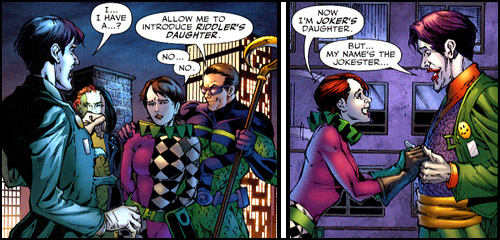 As fate would have it, this band of "Challengers" allied with Duela's father — the Jokester of Earth-3. Here, the Joker's counterpart was a (relative) force for good. The Jokester conceived Duela, with a woman named Evelyn Dent, who then disappeared. The Jokester's crime fighting career began as a common comedian. His act was critical of Owlman and his sidekick, Talon. After Owlman beat him and murdered the his assistant, Harley, the Jokester began a crusade against the duo. He eventually teamed up with his former girlfriend, Evelyn, who had become Three-Face. "Eve" married the Riddler and Duela was raised believing that the Riddler was her father. (This explained why Duela had suffered from such an identity crisis over the years.)