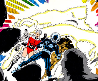 Or did they? The team found themselves instead in an alternate dimension (perhaps the antimatter universe), where they met their evil counterparts: The Power Posse. They were a crime ring fronted by an adult strip club. Their "Oberon" worked the ticket booth; Max was again the mastermind; Ice and Sue were "entertainers"; Metamorpho a bouncer; and Booster a bartender. They also met a set of perverted Marvels: Mistress Mary and her brother; and a King Kong sized G'nort. (#8) These counterparts were none the quicker and the Buddies escaped their confrontation with the Posse. It could easily have b een that this hell was meant to be Beatriz' personal hell, which surely could include such a horrible ordeal. Beetle tried to convince Bea that it was in fact, not Tora. They were left wondering how to return home, when Guy jokingly tapped his heels and said "there's no place like home." Of course (!) this worked. Dr. Fate angrily reclaimed his artifact and the team went on about its... business. (#9)