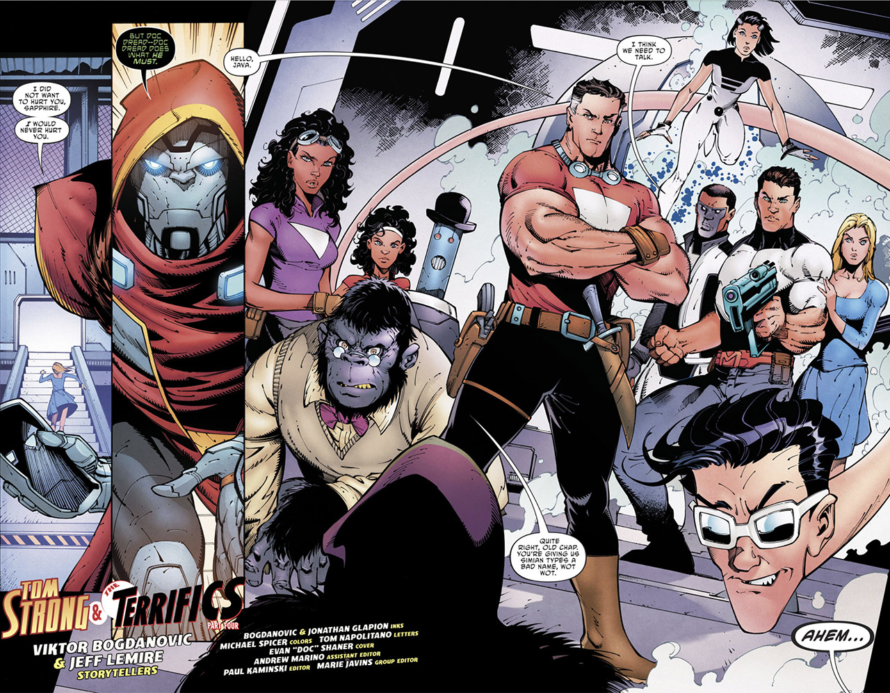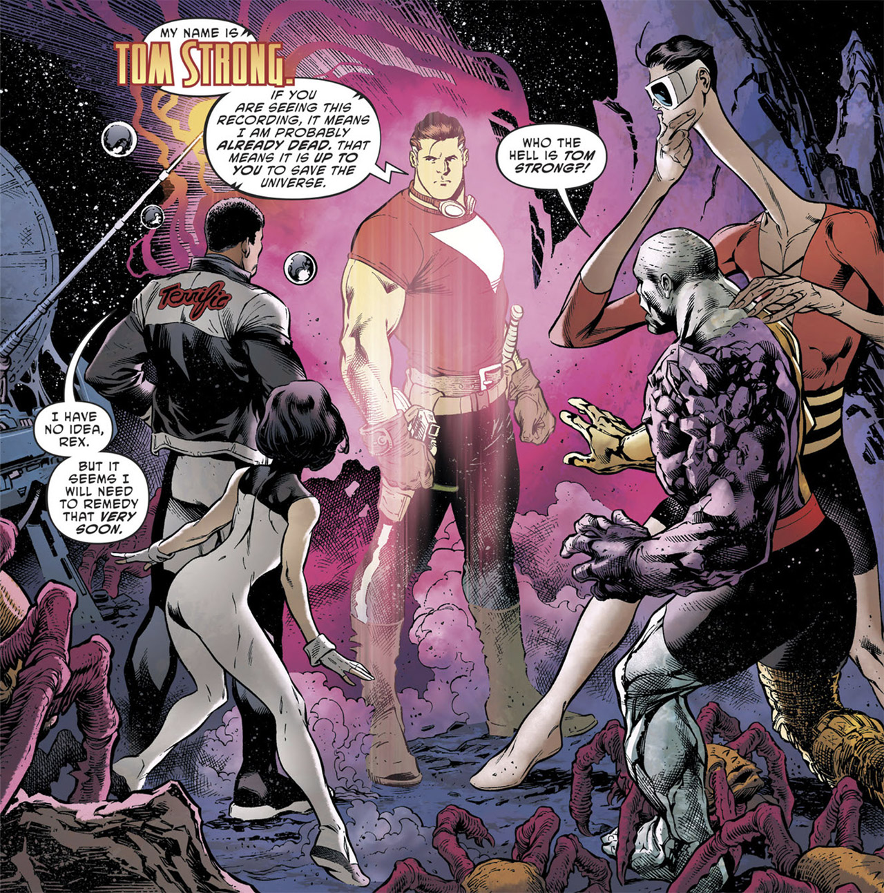 The group stumbles upon a message from Tom Strong. From The Terrifics #2 (); by Jeff Lemire and Ivan Reis.Team Strong allies with the Terrifics to confront Dr. Dread. From The Terrifics #10 (); by Jeff Lemire and ?.