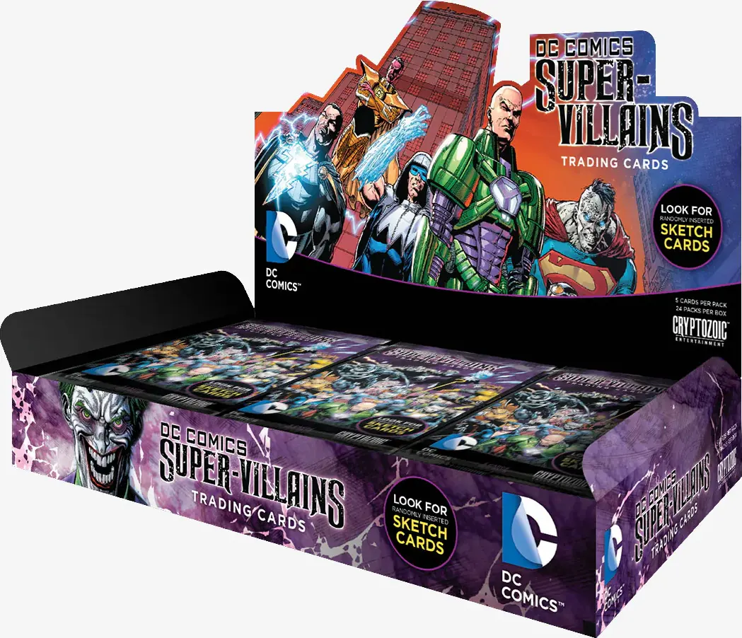 Featuring new and classic art, the base set features the greatest villains from the DC Universe. The base and insert sets were also issued in silver and gold parallel variants. This set is considered harder to find than other Cryptozoic sets (lower print runs?).