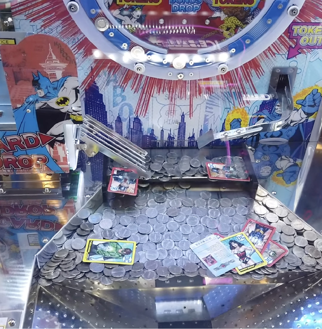 To win cards, players press a button to control the release of tokens onto the "playfield," where a pushing mechanism slowly pushes tokens and cards toward the slot.