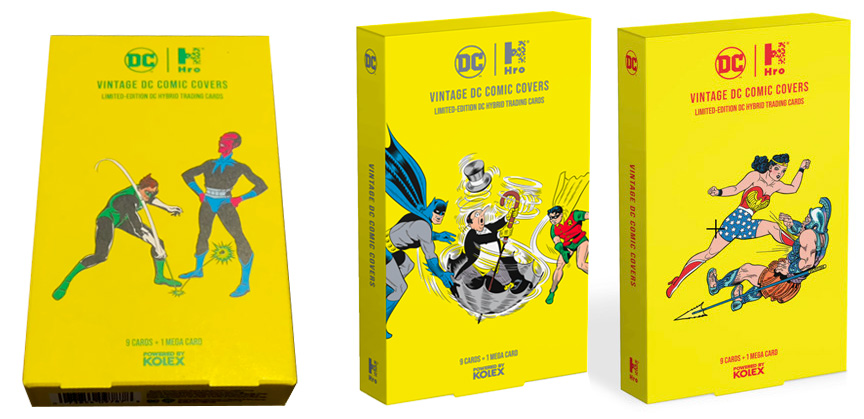 Vintage DC Comic Covers (July 2024). Set of 18 + 3 Mega. A pack contained 9 cards + 1 Mega card. "Limited quantities" were available exclusively on Hro's website for $35. Four different package variants. Allegedly, when they shut down the company said it would destroy any unsold packs; potentially rare because of this. Indeed they do not come up at auction very frequently.