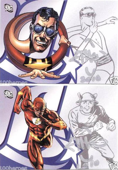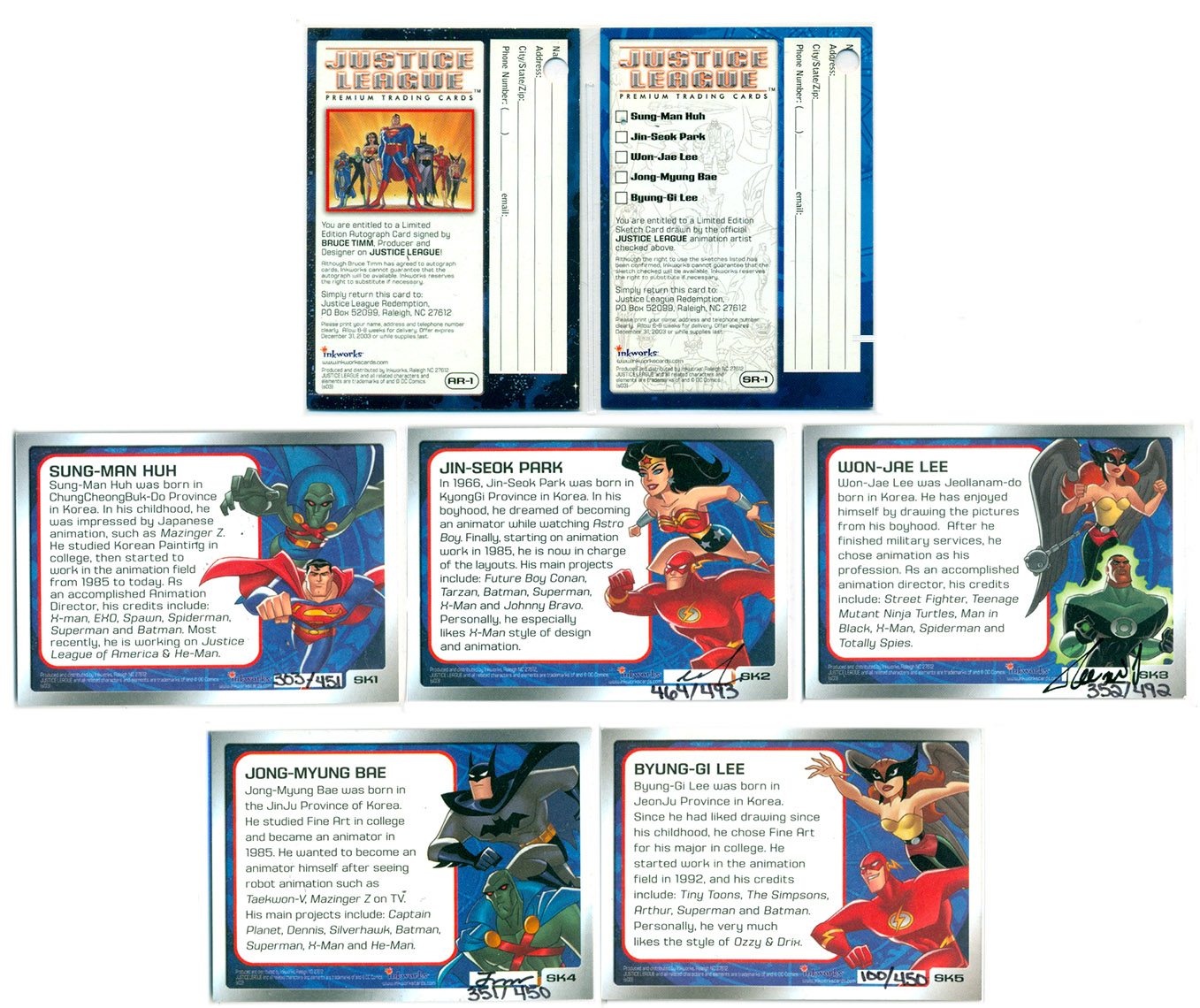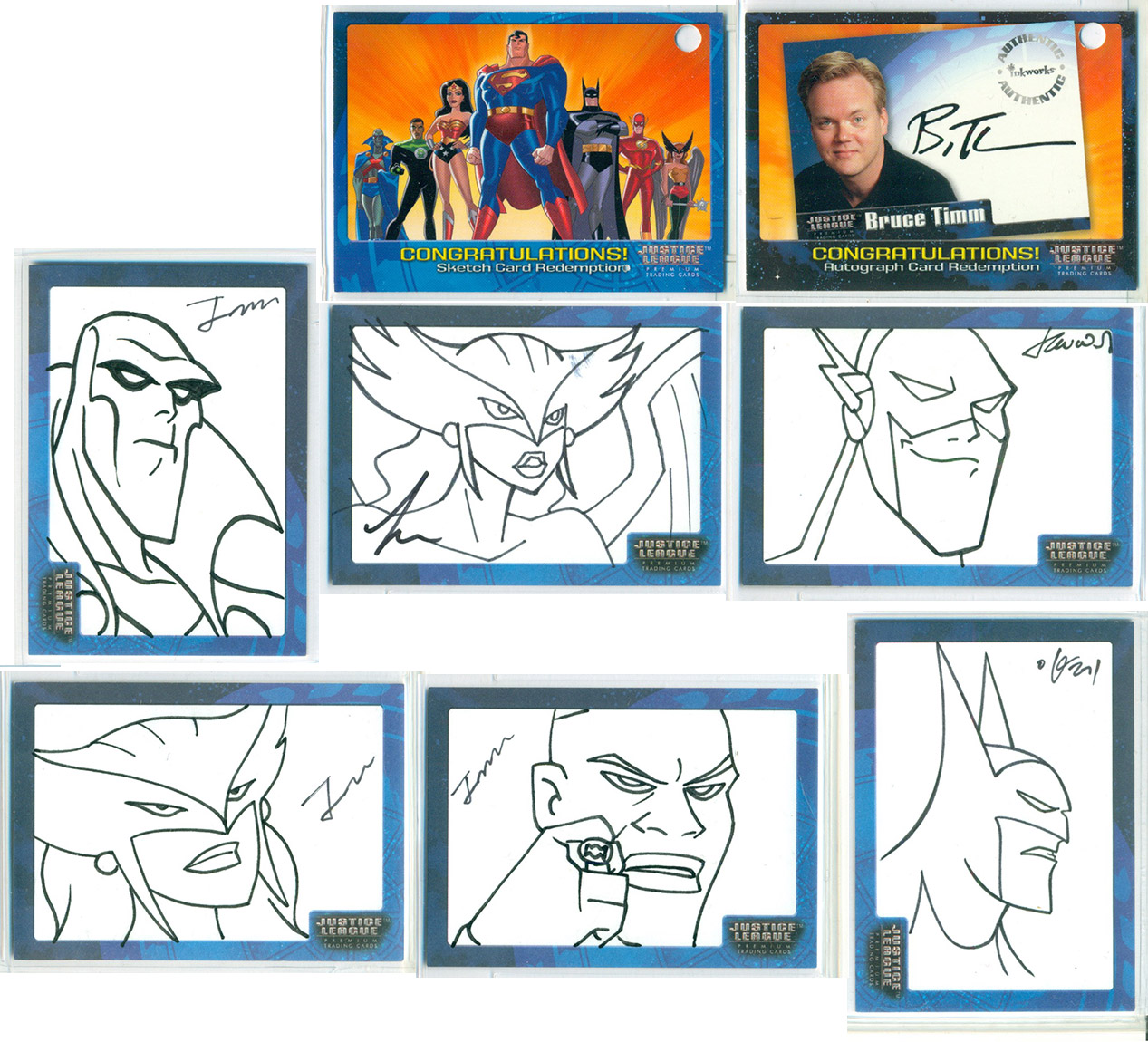 Front and back sides of the Justice League sketch cards. Redeemed if you submitted the SR-1 card. Also shown: the Bruce Timm autograph redemption card.