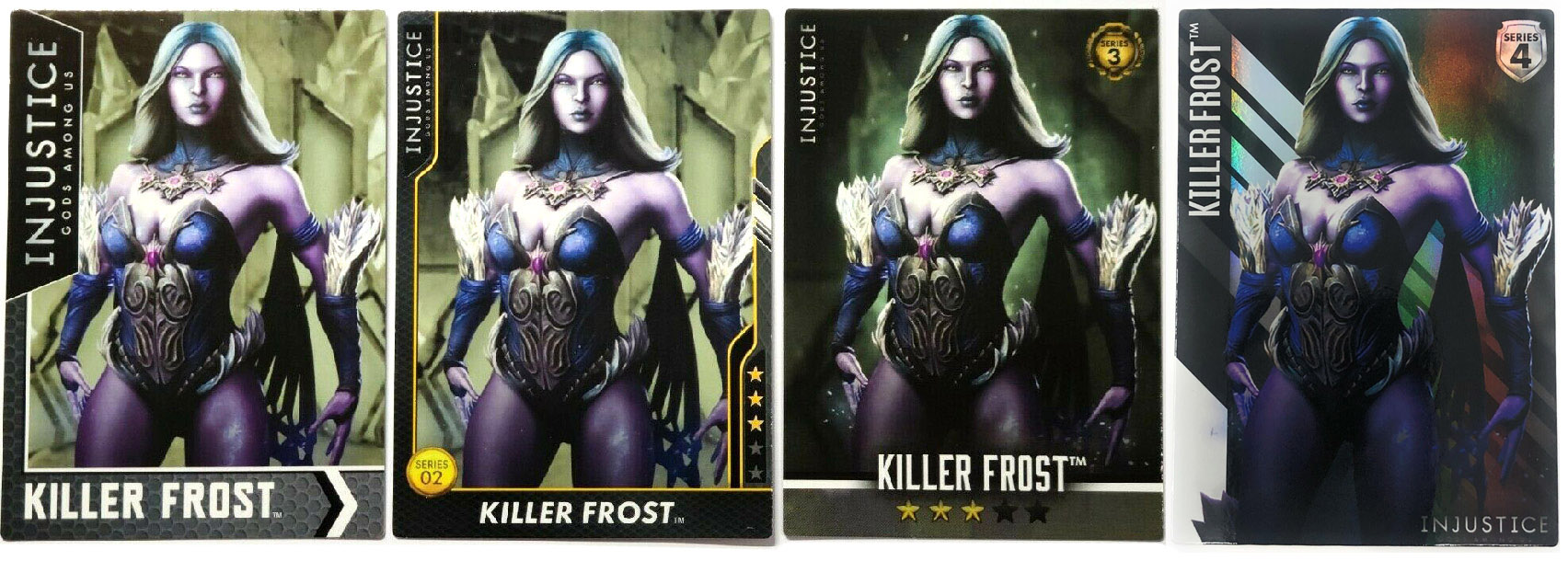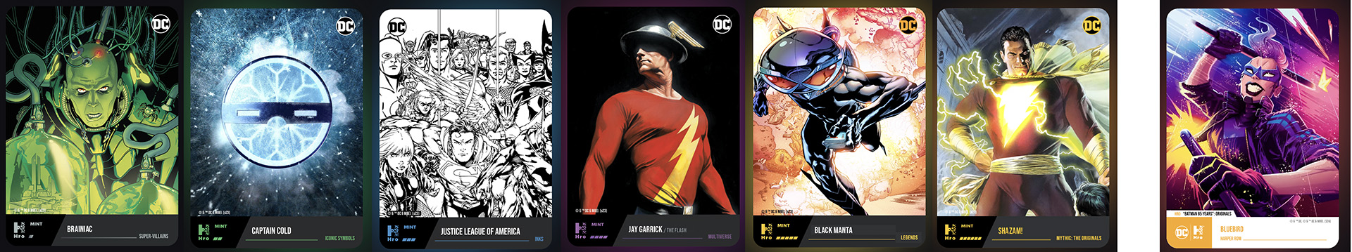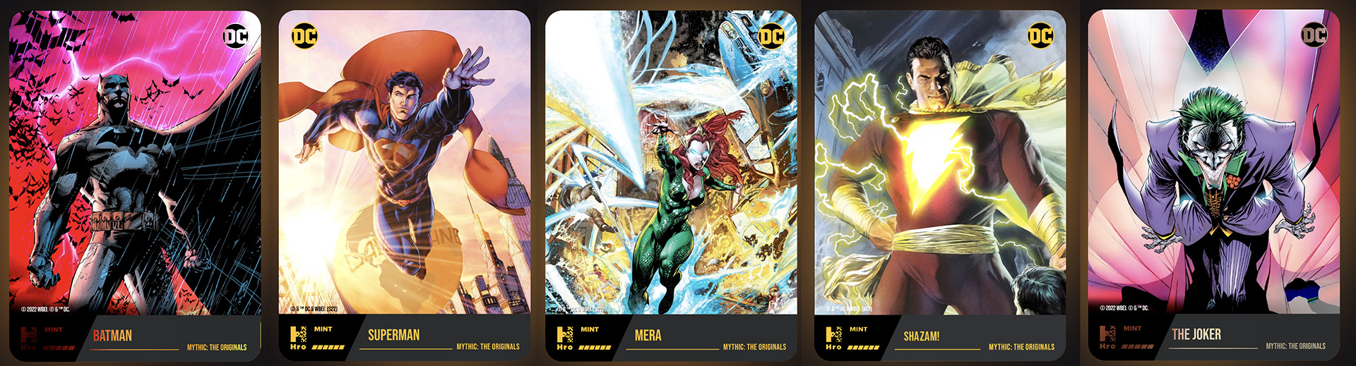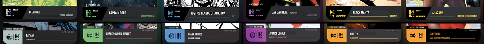 A card from each tier of rarity: Common (gray), Uncommon (green), Superior (blue), Epic (purple holofoil), Legendary and Mythic (gold holofoil), Hro (special).Comparing card designs for Chapters 1–3 (top) with Chapter 4 (bottom).DC Unlock the Multiverse: Mythic tier cards are highly valued (only 1,000–1,500 copies minted/printed).