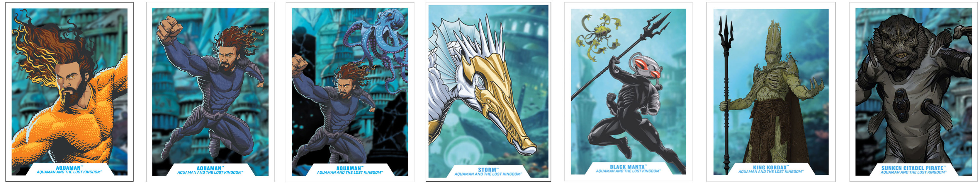 Three figures have cards with black-and-white images and a differently-colored back side. In 2021, the SDCC was online only, so these were just released around that time, making them easier to find than traditional, in-person convention exclusives.