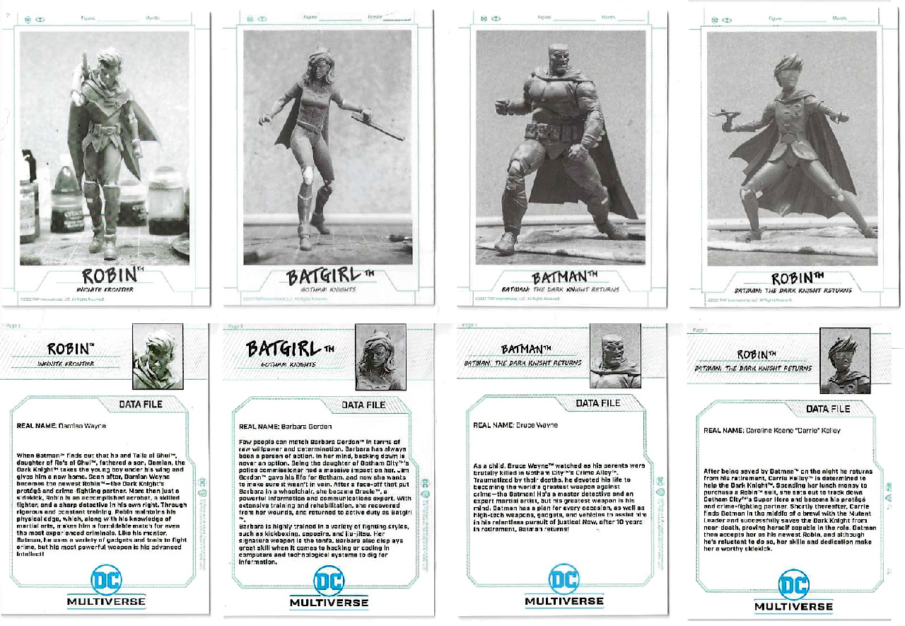 Each toy in the McFarlane Toys DC Multiverse series shipped with a collectible card. The listings here mirror the text that is printed on the front of the cards. Information in parenthesis is not printed on the card, but is included for clarification.