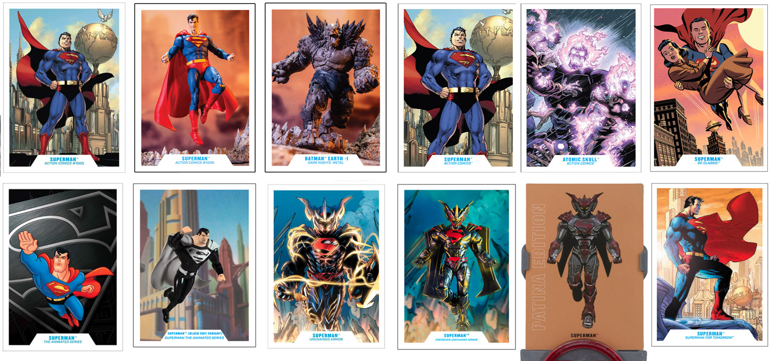 Bottom: Animated • Animated Black Suit • Unchained Armror • Energized Unchained • Unchained Patina Edition • "Superman for Tomorrow" statue