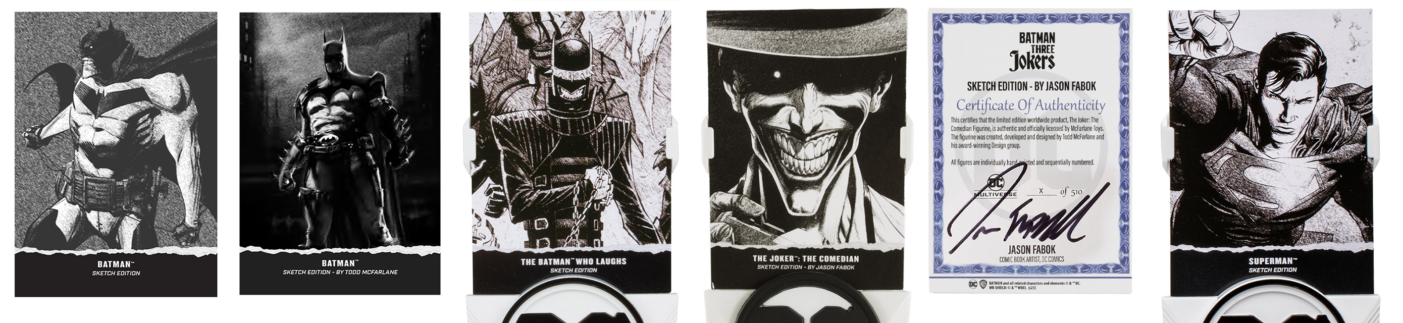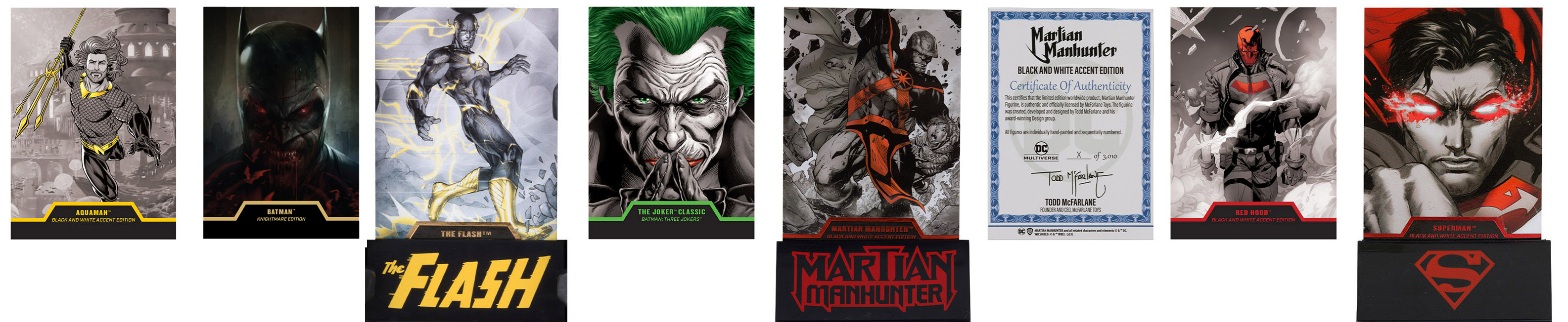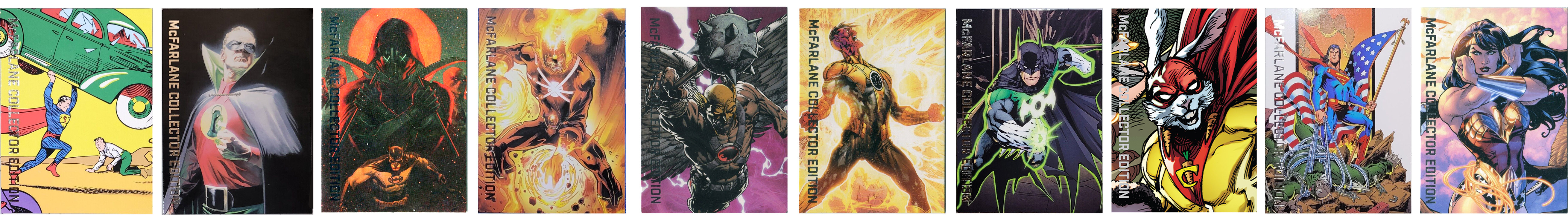 This section lists McFarlane Toys DC limited edition figures. Most of these shipped in a black box and included special stands for the cards. The backs feature a "Certificate of Authenticity" and are numbered (the runs varied).