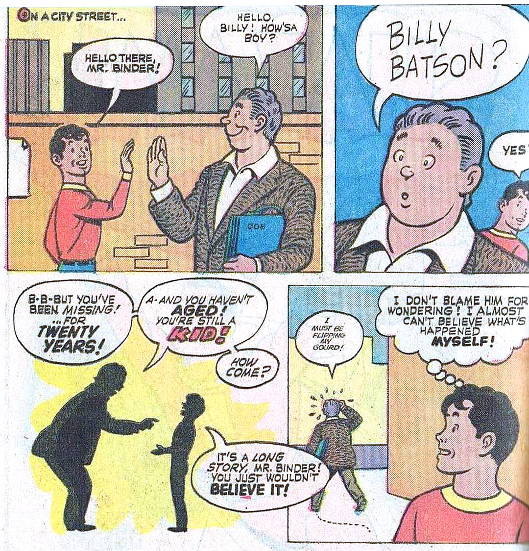 In February 1973, on a comic book page drawn by C.C. Beck, a young man passed an older fellow carrying a briefcase with the initials “O.O.B.” “Morning, Mr. Binder!” chirped the young boy. “Morning, Billy!” waved the man, before realizing that he was talking to Billy Batson, who’d been missing for 20 years, and hadn’t aged a day.