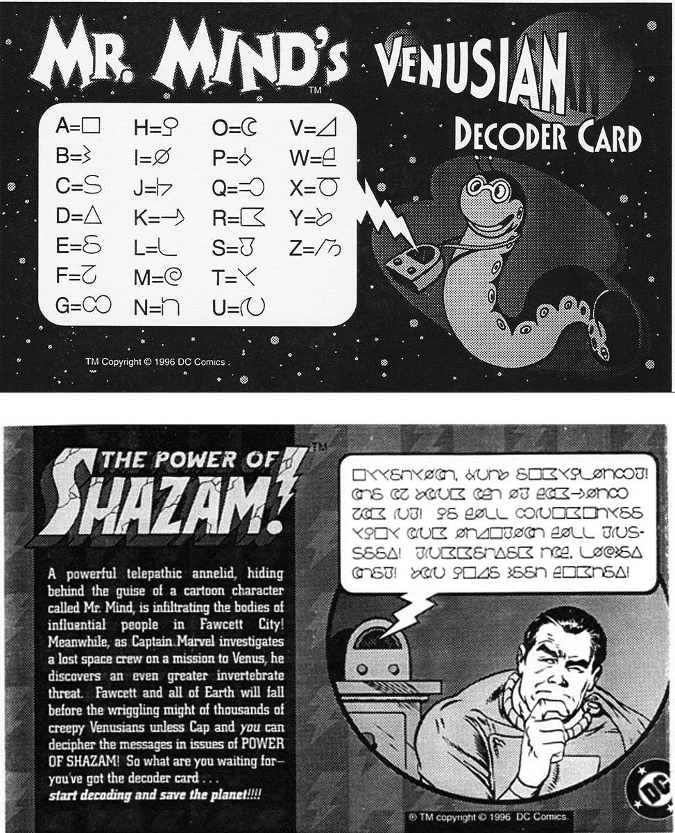 "As I was putting things away, I discovered my copy of the Mr. Mind Decoder Card. When Mr. Mind made his appearance in Power of Shazam!, we had some of the messages in Venusian. You had to send away to DC to get the decoder card. I forget how many thousand DC printed and sent out. Kinda fun, isn't it?”