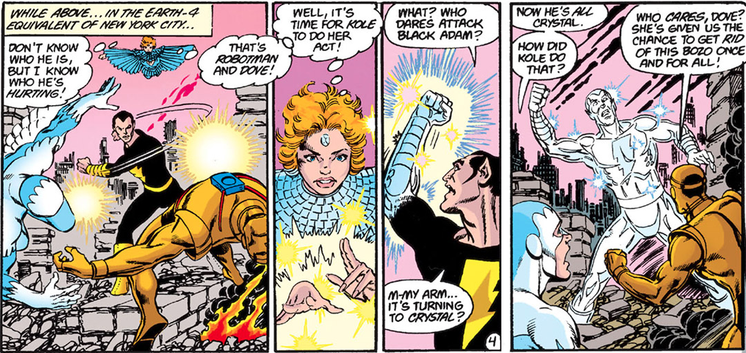 As the existence of Earth-S came to an end in the first great crisis, Black Adam was turned entirely to crystal by the Teen Titan named Kole. (Crisis on Infinite Earths #10)