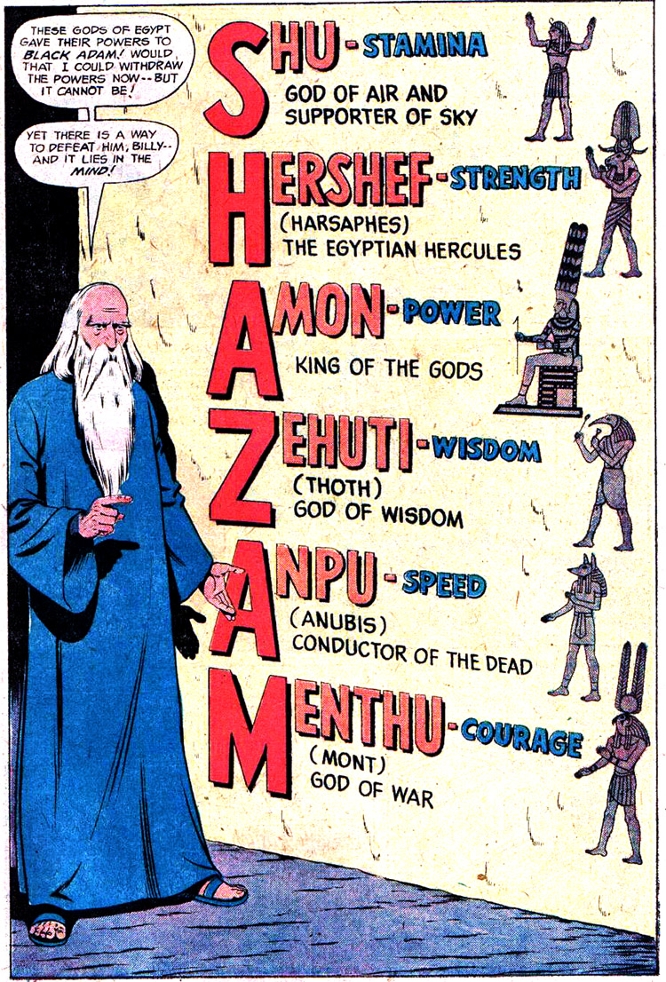 Circa 1200 BCE, Shazam became a high priest to the pharaoh Ramses II of Egypt. As the wizard grew older, he sought a champion worthy to inherit his powers. The young prince Teth-Adam of Kahndaq (Ramses' son) impressed the wizard with his fairness and decency. But before Shazam could bestow his powers, his daughter Blaze made a deal with the god Set. When Teth-Adam spoke the name "Shazam," instead of gaining the wizard's powers, he was blessed with the power of seven Egyptian gods: Shu, Heru, Amon, Zehuti, Aton and Mehen. Thus, though Adam spoke the name "Shazam," he did not draw power not from the wizard.