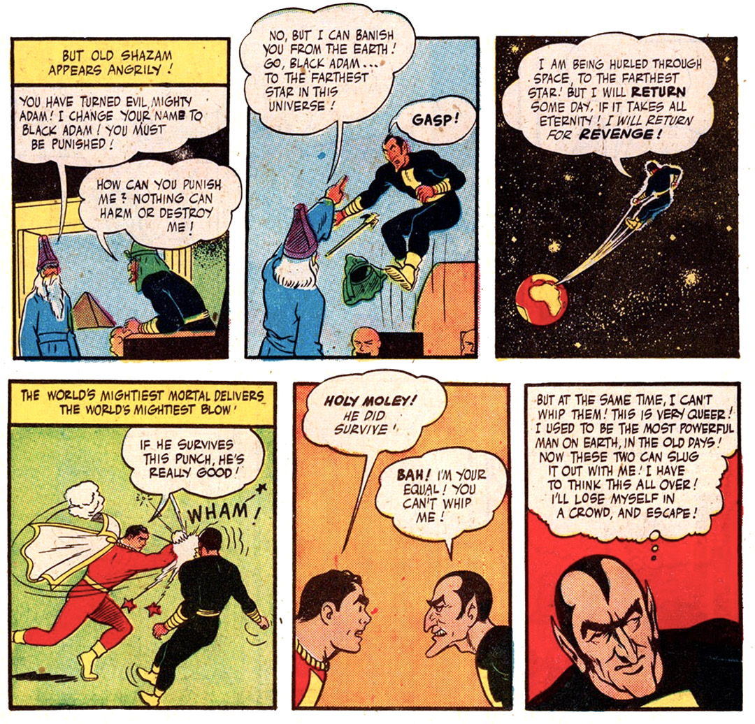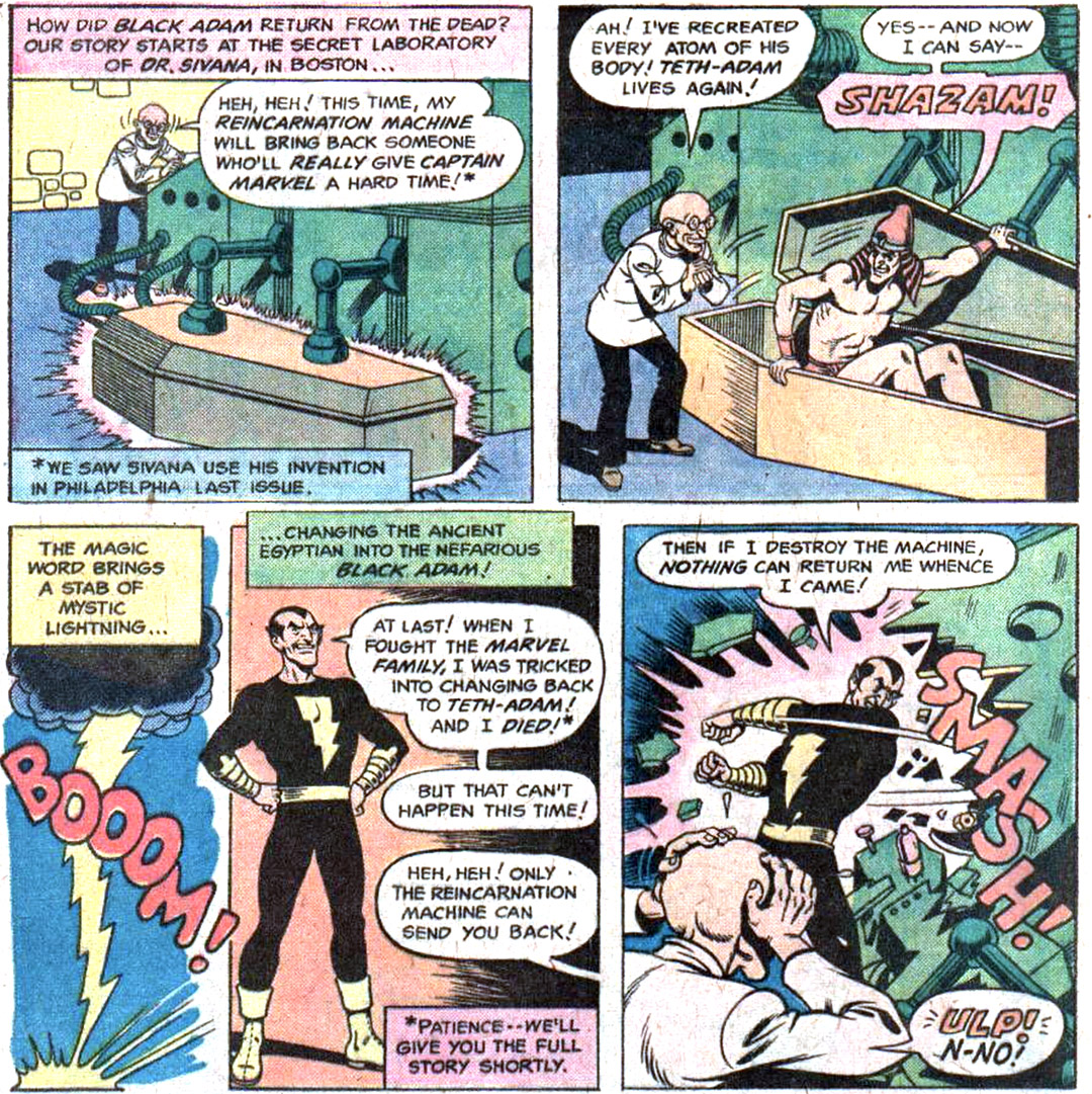 In Boston, Captain Marvel's arch enemy, Sivana, used his reincarnation machine to bring back Teth-Adam. When the Egyptian emerged from his coffin, he uttered "Shazam!" and became Black Adam again. Adam destroyed the machine and made swiftly for the Rock of Eternity to confront his enemies. After another round trip to the past, Dudley ("Uncle Marvel") once again tricked Adam him into saying "Shazam." Now mortal again, Captain Marvel hit Adam with an "amnesia punch" so he would not remember to say it again. This time, he did not die of old age. (Shazam! #28)