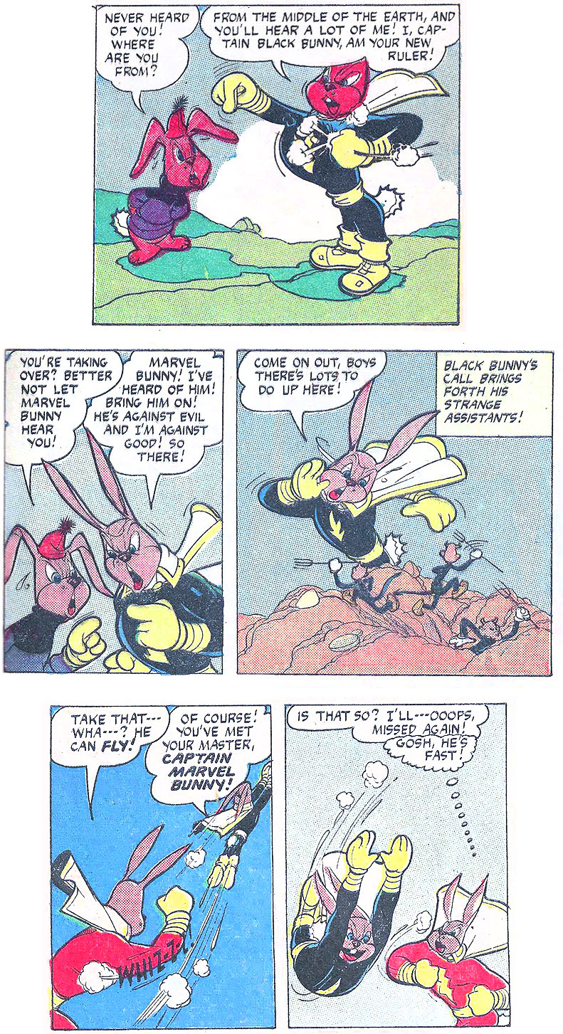 Black Bunny knocked out Hoppy and retreated to his underground kingdom. Hoppy awoke and, as Captain Marvel Bunny, pursued him there. Black Bunny was enjoying his newfound riches, but he feigned submission to Marvel Bunny. Before he could leave, Black Bunny said he needed to put his boots on — the boots turned out to have an artificial source of power — outfitted with rockets, they enabled him to fly. Still, Black Bunny was no match for the Marvel Bunny and he was captured quickly.