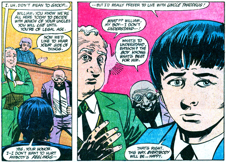 The new Billy Batson was 15 years old and lived in San Francisco. While staying with his (real) Uncle Dudley, his parents were killed in a car accident. Dudley was a stage magician and even had a pet rabbit named Hoppy. At his parents' funeral Billy met Dr. Thaddeus Sivana, Billy's mother's older step-brother. A custody battle ensued, which Sivana won and Billy went to live at his house. He met his cousins Beautia and Magnificus, who might have been tolerable enough except that Sivana turned out to be abusive towards him.