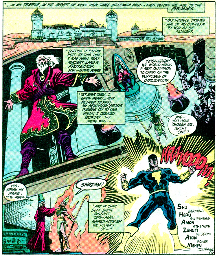 Billy eventually stumbled upon Shazam's longtime secret lair and the wizard gave him access to his own ancient powers. By saying the wizard's name, Billy became Captain Marvel and was powered by the the wisdom of Solomon, the strength of Hercules, stamina of Atlas, power of Zeus, courage of Achilles and speed of Mercury. Theo Adam returned as well as Black Adam, Captain Marvel's arch nemesis. (Power of Shazam Graphic Novel)