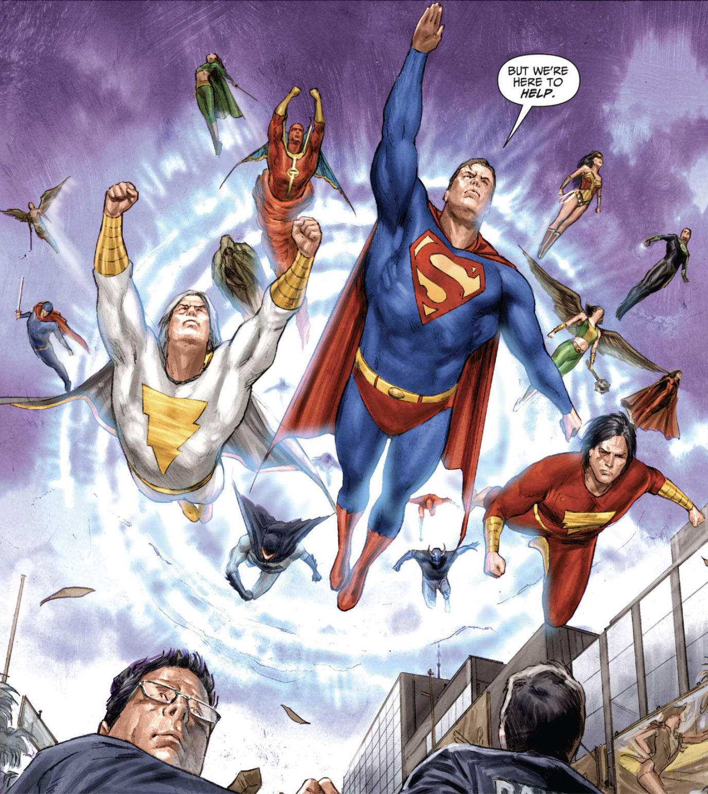 Freddy calls on the Shadowpact and JLA. Sabina recruited the transformed Merlin, now a bit evil to help her. They bring demon hordes through to Earth. Freddy decides the only wat to win is to sacrifice himself and take he and Sabina through a one-way portal. This act of self-sacrifice was the impetus needed for Zeus to reveal himiself, as his ally Zareb. Zeus is the Lord of the gods of magic, and he calls them all to align under him. When Freddy says Shazam, he receives all their powers and is the new Shazam. It opens a portal that the demons and Sabina are sent through. Zeus needs Freddy as an anchor to Earth. His ongoing mission will be to keep magic in balance, darkness at bay. (#12)