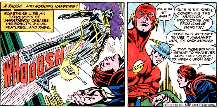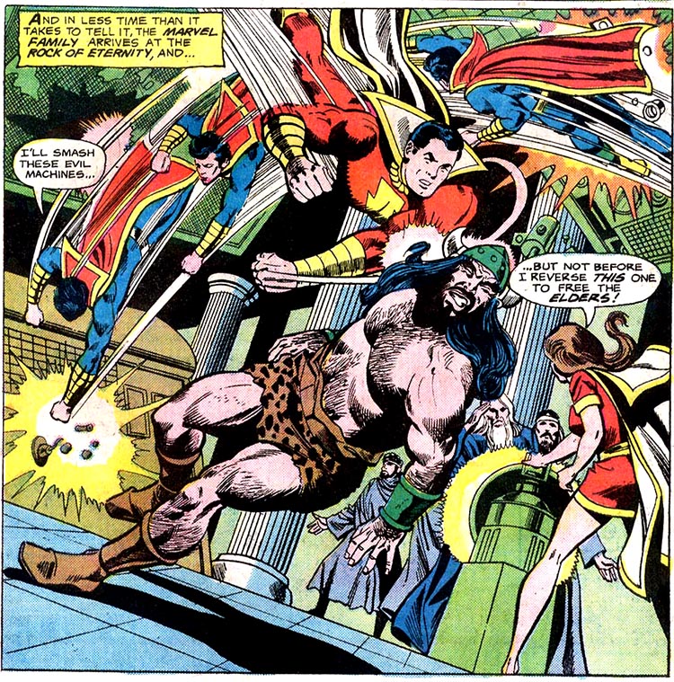 The heroes of Earth-S band together again. From Justice League of America #135 (1976); art by Dick Dillin and Frank McLaughlin. Ibis barely manages to send Mister Atom into space. From Justice League of America #137 (1976); art by Dick Dillin and Frank McLaughlin. The Marvel family wraps things up. From Justice League of America #137 (1976); art by Dick Dillin and Frank McLaughlin.