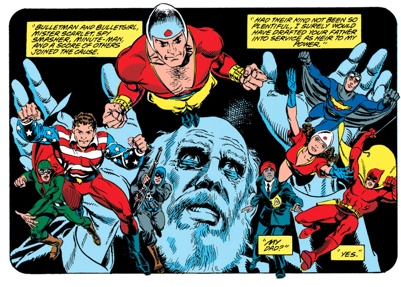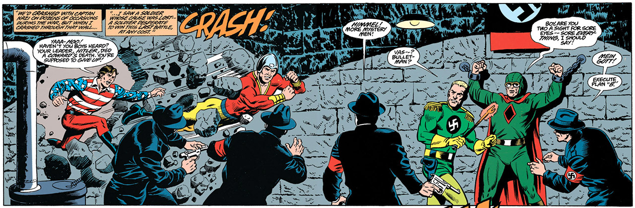 Minute Man, Bulletman and Spy Smasher fight Captain Nazi. From Power of Shazam! #8 (Feb. 1996); by Jerry Ordway, Curt Swan and Mike Manly.from Power of Shazam! #12 (Feb. 1996); by Jerry Ordway and Peter Krause.
