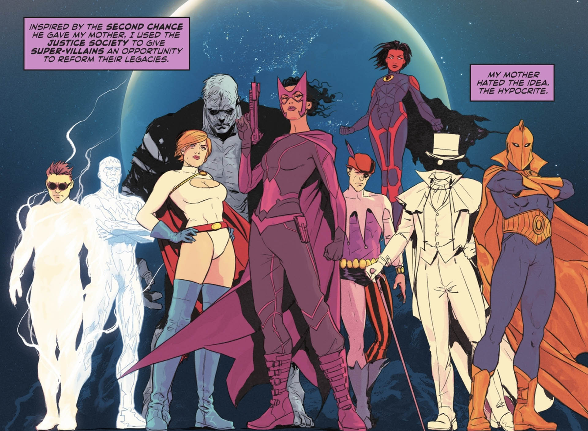 18 years in the future: The Justice Society informs Selina Kyle and Helena Wayne of the Batman's death. The Huntress offers redemption to a group of rogues to form a new JSA: Gentleman Ghost, Harlequin's Son (first in-story appearance), Icicle II, the Mist III (Kyle Knight), Red Lantern II (Ruby Sokov) and Solomon Grundy. They are all killed by Per Degaton. Note: This is the first adult appearance of Kyle Knight as the Mist. He is the son of Starman Jack Knight and first appeared as an infant in Starman vol. 2 #38 (Jan. 1998). First in-story appearance of the Harlequin's Son, a character originally proposed as a member of Infinity, Inc. (but shelved).