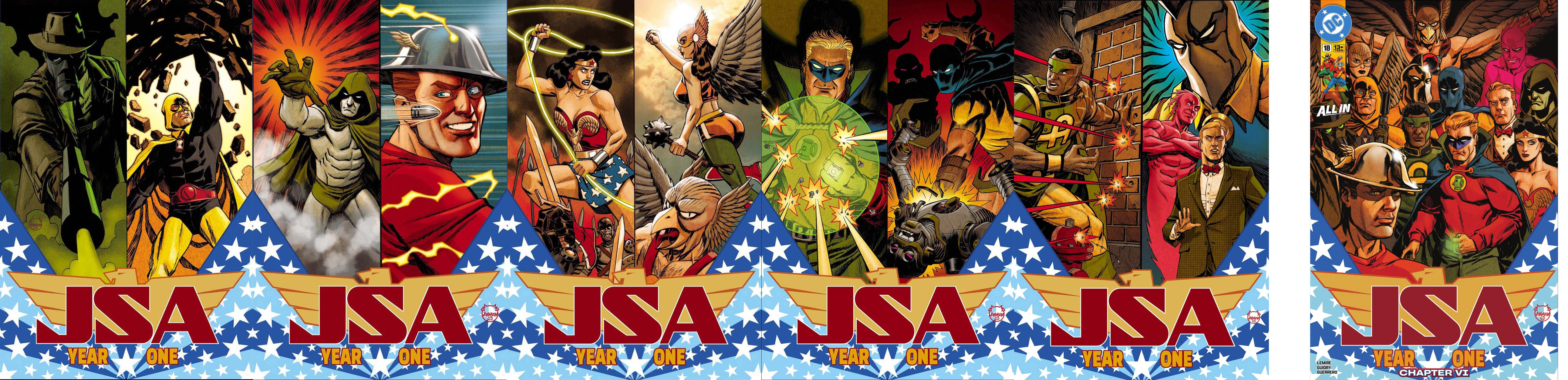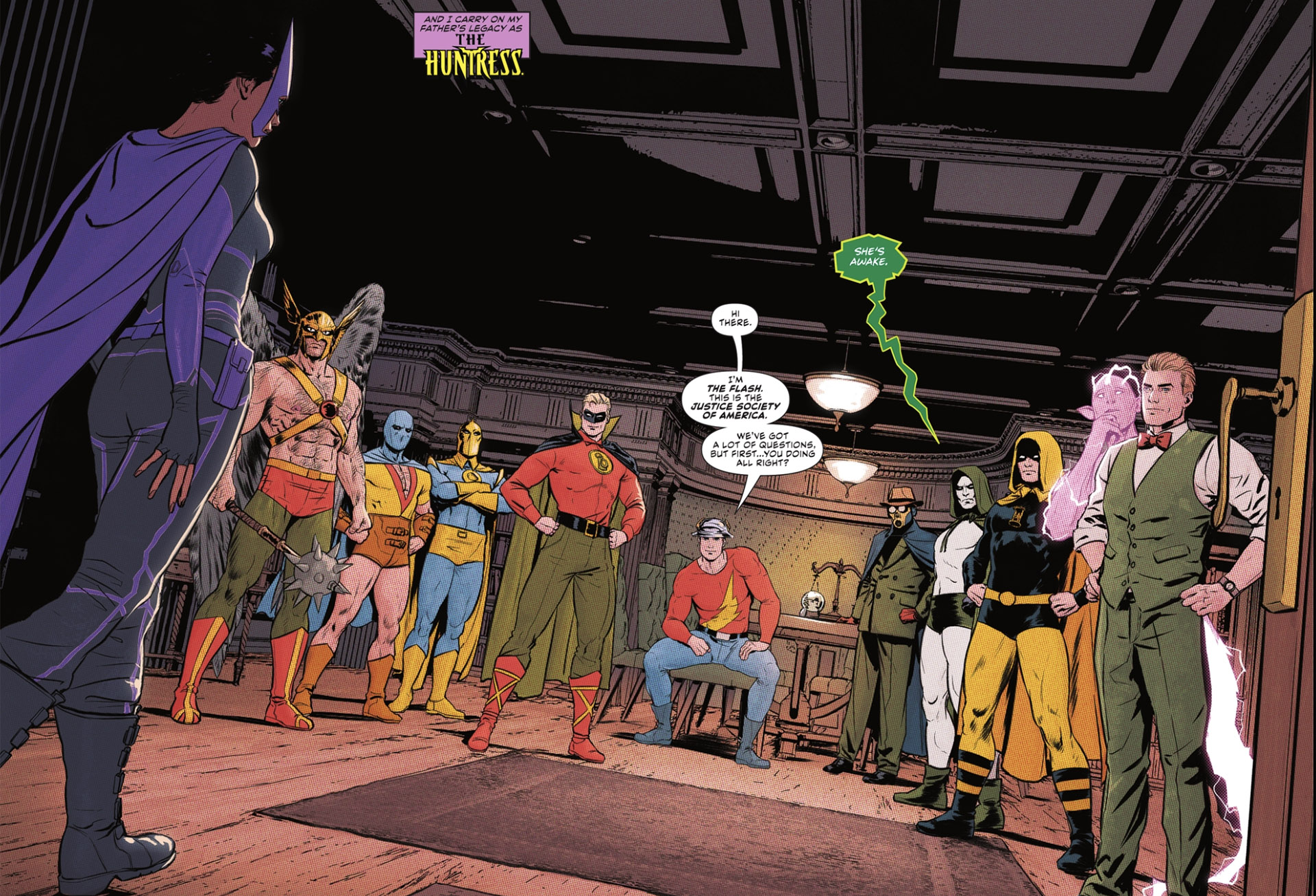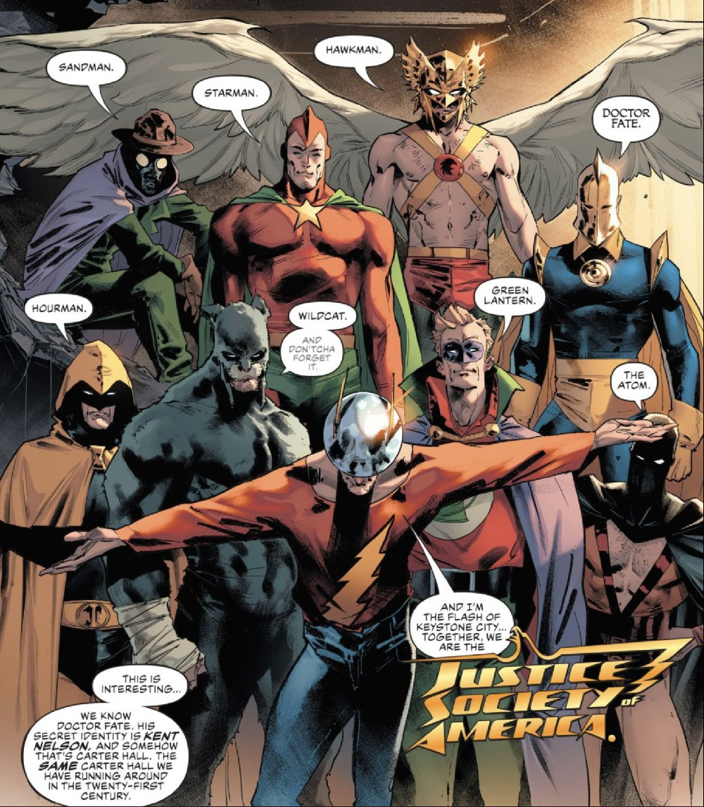 1941: The Justice League's Flash (Barry Allen) and Green Lantern (John Stewart) arrive from the future in pursuit of a Totality fragment. They meet the Justice Society of America (first Rebirth appearance) in their secret New York headquarters: the Atom, Dr. Fate, the Flash, Green Lantern, Hawkman, Hourman, Sandman, Starman and Wildcat. Note: The JSA's original HQ was in Gotham City.
