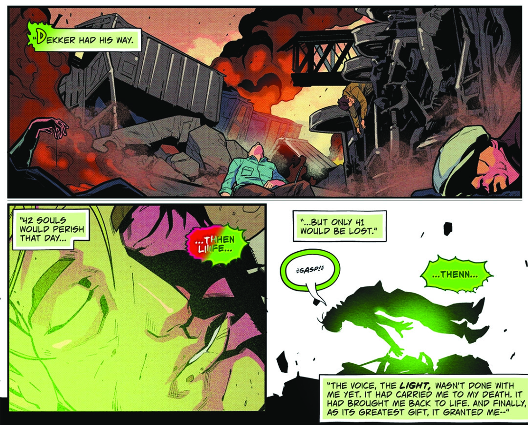 Construction engineer Alan Scott is aboard a train during its test run when a rival engineer, Albert Dekker, blows the train off its track, killing all but Scott. Alan survives because of his ancient, magic green lantern formed from the ancient mystic Starheart. He fashions a ring from the lantern that enables him to tap into its great power. Scott adopts the identity of the Green Lantern I and executes justice on Dekker. Note: This event occurs earlier than its original publication per the timelines in Zero