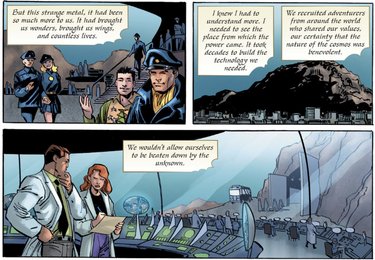 Part 2: Wes Dodds meets Ted Knight, a young scientist applying for a grant to perfect the alloy needed to collect his newly discovered cosmic energy. Meanwhile, Jonathan Smythe carries out another act of sabotage. NOTE: According to Starman #20, Ted had not yet become Starman upon his first meeting with Wes.