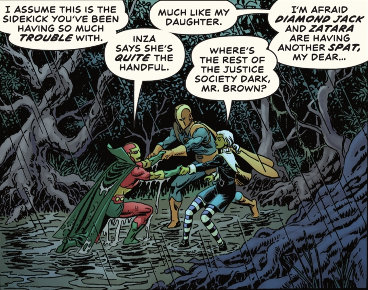 13 January 1941: Dr. Fate and Salem search Slaughter Swamp for Mister Miracle of the Justice Society Dark (referencing Diamond Jack and Zatara). Note: First in-panel appearance of the Justice Society Dark and of Salem, both preceded by profile mentions in The New Golden Age #1 (Jan. 2023).