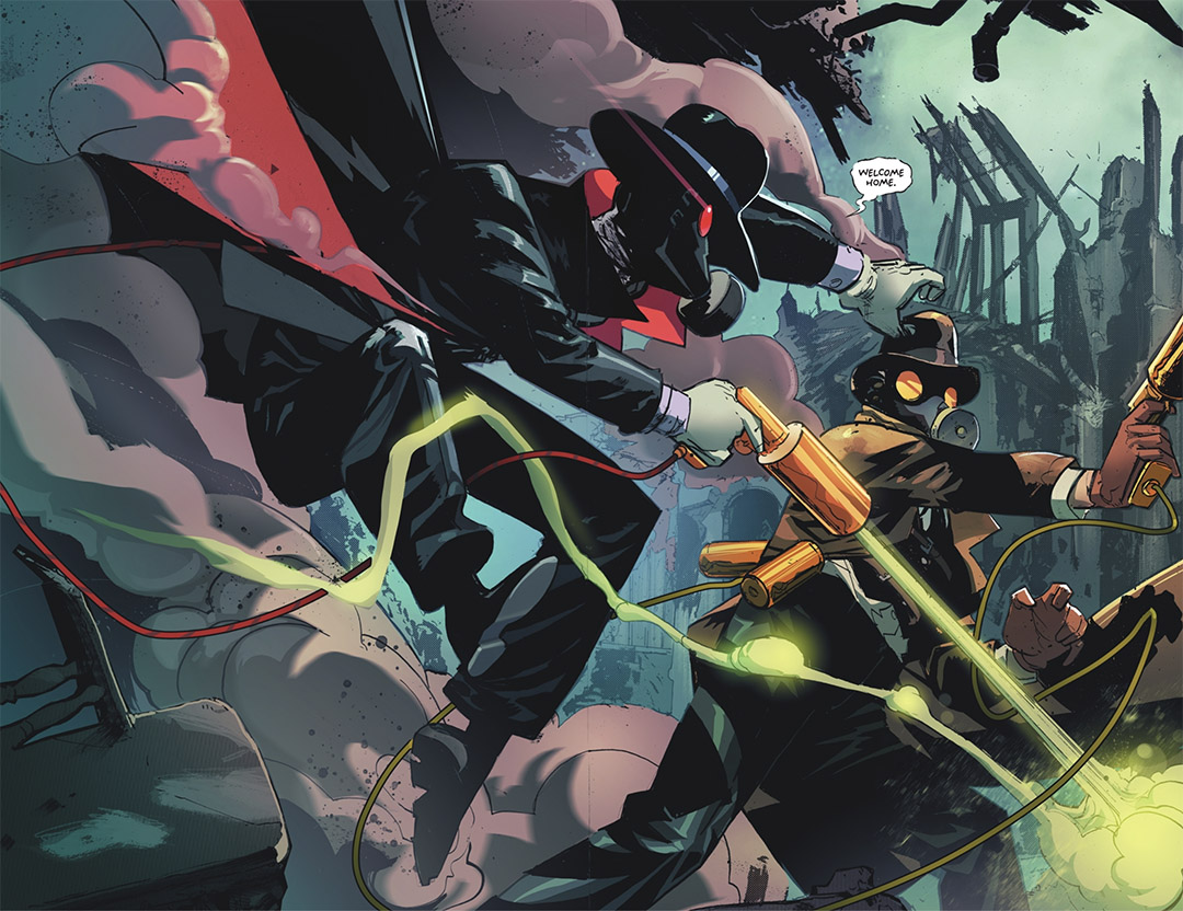 Part 4: Jonathan Smythe presents his disintegration device to the Army, but his gangland employers subject him to his own machine for failing them. He flees as far as Opal City before he apparently disintegrates. Ted Knight and Wes Dodds learn that "Smythe" was not his real name. NOTE: A news broadcast mentions that England has formed an alliance with Russia to stand up against further German aggression in Europe. This is not historically correct; although the Russians proposed such an alliance in the spring of 1939, no agreement was reached.