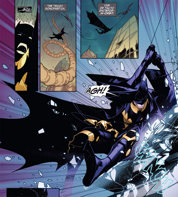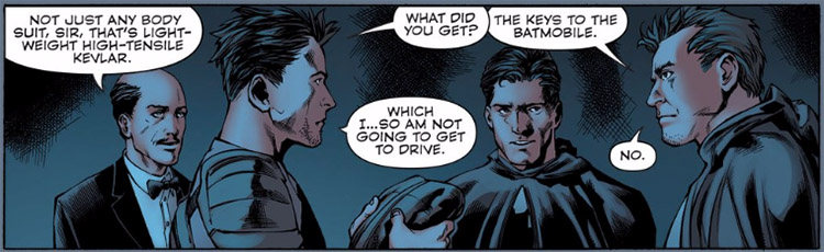 When Telos departed, Batman took Dick to a nearby Gotham City, where Wayne accessed a Batcave. Grayson froze when Oracle — the vision of his wife, Barbara — greeted him on the screen. After a meeting between two Batmen, Thomas returned with a gift for Dick from his "son," a lightweight body suit made of high-tensile Kevlar. (#2)