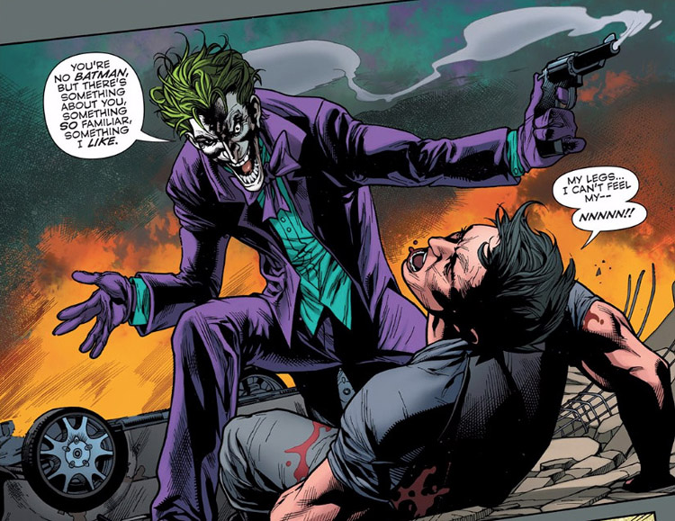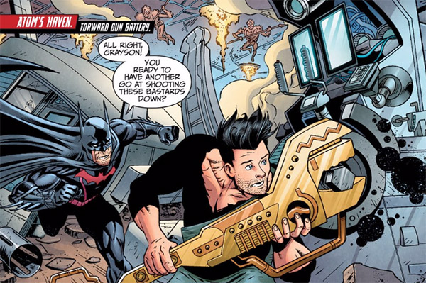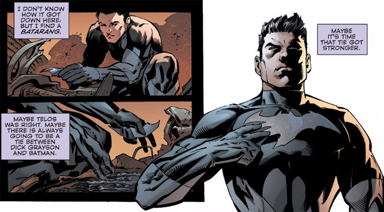 A group of villains followed Thomas and Dick out of Gotham, and Batman sacrificed his life to blow them up. Grayson was thrown clear of the blast, but the Joker surprised him and shot Dick in the spine, rendering him paraplegic. (Telos returned just then, and snapped the Joker's neck.) (#3) Telos gifted to Dick a suit of armor that provided mobility and strength. Grayson showed compassion towards Telos; he challenged his benefactor to defy Brainiac and remember his own past. (#4) When Dick found a batarang in some wreckage, he applied it to his chest and accepted the cosmic connection between him and Batman. (#5) Even Superman recognized Dick's potential and stopped to encourage him, saying he might be the only one who could secure the help they would need from Telos. (#6)
