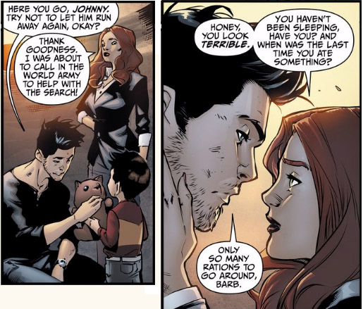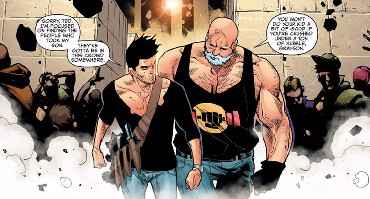 As Apokolips neared, Earth's heroic "wonders" mobilized to fight Darkseid's four Furies, and Major Sonia Sato of the World Army prepared to evacuate the planet. Society had already descended into chaos from previous battles, and as people scrambled for safety and sustenance, the Graysons tried to help keep the peace in their camp. (#3) Barbara was well trained in self-defense, but Dick was no fighter. They befriended Ted Grant, an ex-boxing champ who help the Graysons and offered Dick training when they could do it. (#6) Note: In original DC continuity, Ted Grant was Wildcat.