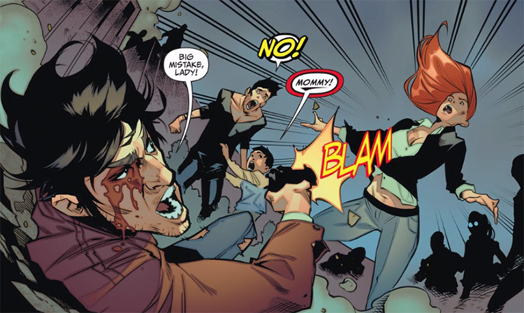 People began going berserk as the Furies stormed the planet and the magician John Constantine (from an alternate universe) stepped up to recruit other super-humans (Brainwave, Obsidian, and Jonni Thunder) to fight. (Earth 2: World's End #8) This band arrived in Chicago just as Barbara Grayson was shot and killed while trying to board an outbound train. (#9) Dick and Tommy had no time to grieve; they were ambushed but saved by Constantine's band. Grayson was desperate to save his son from the planet's destruction and put Tommy on a train to escape an oncoming tidal wave. (#10)