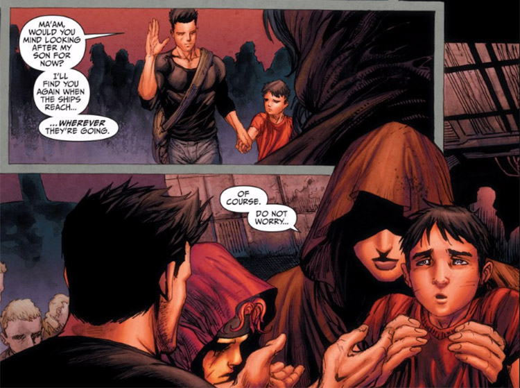 At the Haven, Brainwave tried to possess everyone with his mental powers and for some reason, Dick was unaffected by those powers. (#19-21) The Batman intervened and took down Brainwave with a batarang. (#22) Dick finally found Tommy again but they were not allowed to board the escape ships so once again, he was forced to entrust his son to strangers. He pleaded with a strange woman — who was Big Barda of Apokolips in disguise — to take him with her. Their ship lifted off with the rest of the fleet. (#24) Note: In Convergence #2, Dick said that this ship exploded.