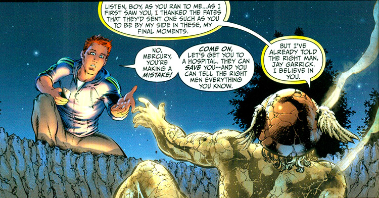 Mercury was dying, and he heralded a danger greater than Apokolips. As his light dimmed, he transferred his remaining power—the speed of a god—to Jay. No sooner had Jay been transformed than the World Army was on the scene. A costume had appeared at his will, and he fled the scene. He tested his powers, which propelled him all the way to Poland, where he met another "wonder," Hawkgirl. (#2) She wasted no time in testing Jay's skills, but given her military training she bested him fairly easily. Before Jay could hone his abilities, they were attacked by the power of the Grey, which consumed all life around them. (#3)