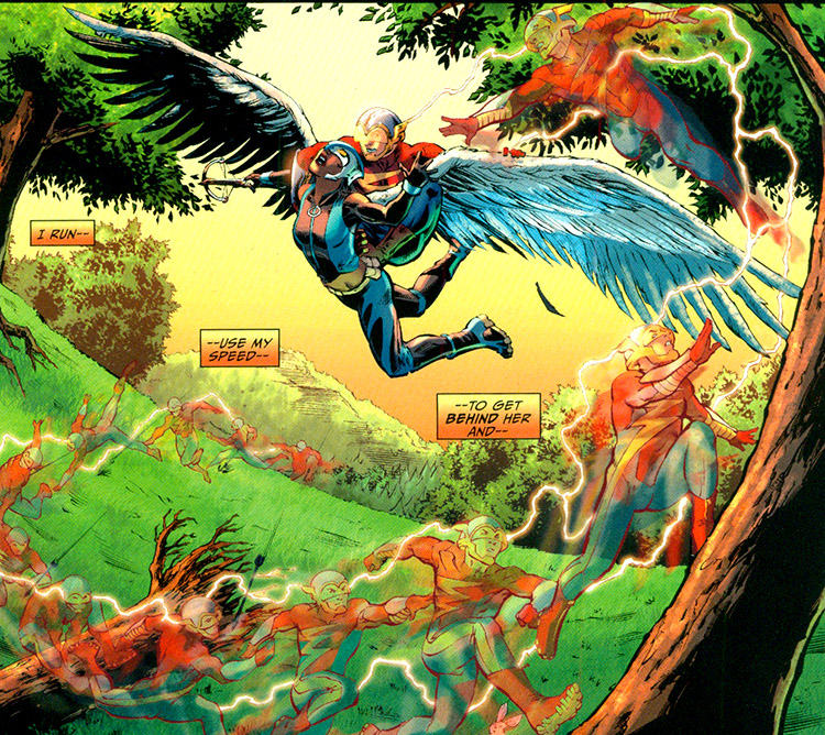 Kendra revealed herself to other heroes in Poland, where she helped the new Flash escape from her former employers, the World Army. (Earth 2 #2) She was battle ready and tested his abilities, besting him fairly easily. Before long they encountered the force that would draw them together with other wonders: Grundy, avatar of the fetid Grey. (#3)