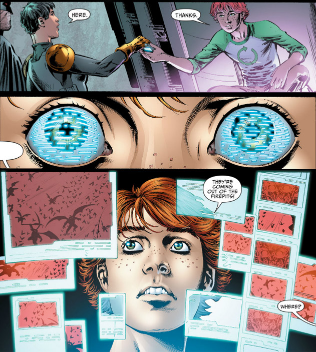 Upon being released, Batman asked Olsen to give his assessment of current events. Handing him a phone, he was instantly up-to-date and alerted the others that Parademons from Apokolips were emerging across the planet. (Earth 2 #18)