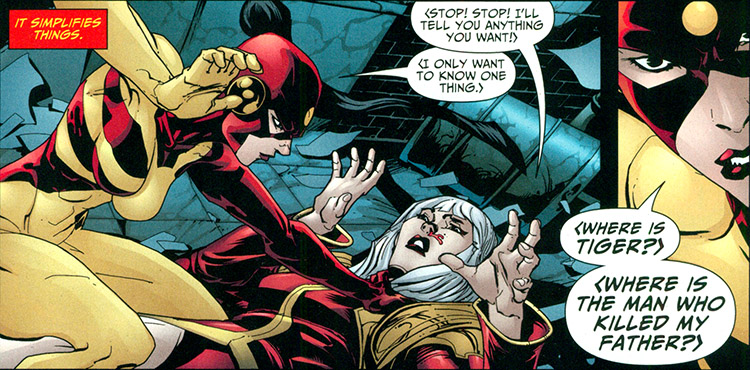Because she spoke no English, her teammates were slow to engage with her, save for Damage, who soon asked Sonia out on a date. (#18) During the course of their battle with Gog, Damage was disfigured; she kissed him despite this. (#22) Before their romance could grow, Damage was killed during the Blackest Night. (Blackest Night #4) Sonia overcame both her grief and the language barrier to deliver his eulogy. Her teammate Sand then played a holographic message for her, recorded by Damage before his death. His words brought her back to life and she channeled her sorrow into a renewed hunt for Tiger and his band of assassins, and with the help of King Chimera, Tiger was captured. To honor Damage one final time, she used Tiger's money to pay for his victims' medial bills in Atlanta (where Damage had caused mass destruction). (JSA All-Stars #7)