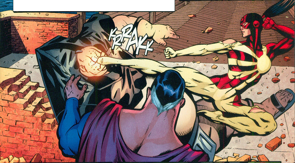 Judomaster versus Kamikaze. From Justice Society of America vol. 3 #11 (2008); art by Dale Eaglesham.Above: On the hunt for Tiger. Below: A holographic reminder of Sonia's first kiss with Damage. From JSA All-Stars #7 (2010); art by Freddie Williams II.