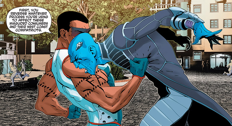 Matter over mind, against Brainstorm. From Mister Terrific #3 (2012); art by Scott Clark and Dave Beaty.