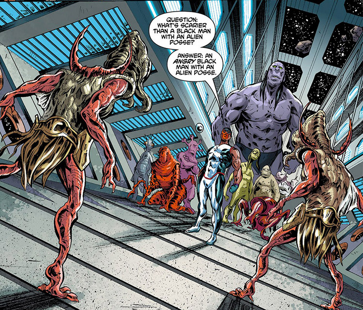 En route back to his Sanctuary, Mister Terrific was kidnapped by the alien Kryl and placed in a holding cell. He quickly mobilized the other prisoners and used his T-mask to escape. (#4) The captives escaped in a small ship and one of them, Py'Lothia, was able to absorb the energy when the Kryl fired upon them. (#5)