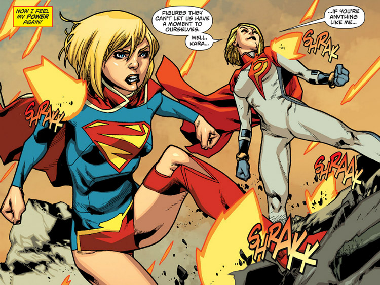 Unlike Helena, Karen took every precaution to avoid her "family" on Earth-0. She had passed that world's Supergirl once before. (Worlds' Finest #6) She soon found that she was connected somehow to her "not sister," when the Girl of Steel came under attack, Karen suffered. Power Girl rescued Supergirl. When the two touched (the first meeting of counterparts from parallel Earths), their memories intertwined. Karen took Supergirl back to her Kryptonian sanctuary where its servants created a new costume for her. Soon its sensors reported an error: Power Girl's duplicate DNA was perceived as a clone's. (Supergirl #18-20)