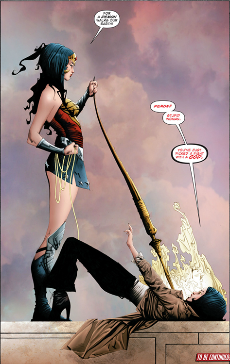 Wonder Woman extracts the trickster, Kaiyo, from Lois Lane. From Batman/Superman #1 (2013); art by Jae Lee. Lois Lane comes to the realizations of her new "life." Both from Earth 2 #18 (2014); art by Nicola Scott and Trevor Scott.