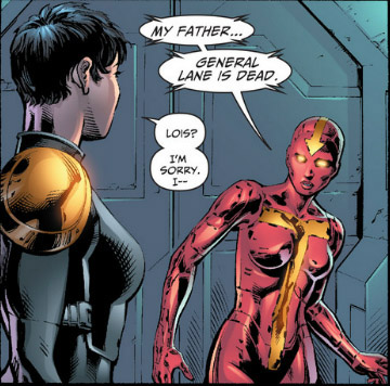Lois met her death under undisclosed circumstances at the Daily Planet. (Earth 2 #1) But somehow the essence of her mind and personality were captured and saved electronically. It's unclear whether Superman had a hand in this or whether Lane used World Army resources to do it. At some point, General Lane must have also been made aware of the Red Tornado project because when it was clear that his own end was imminent, Lane made a desperate move to salvage Lois' psyche. With help from Dr. Robert Crane, they successfully by uploaded Lois' stored essence into the Red Tornado. Just after the transfer, Superman (now under the control of Darkseid) destroyed the Arkham facility and Sam Lane was killed. (Earth 2 #17)