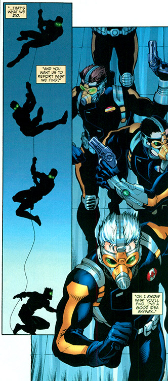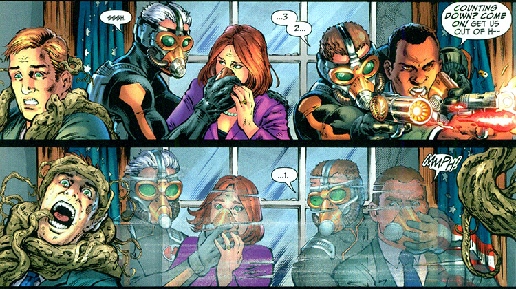 After Grundy was defeated, Khan assigned the Sandmen to find the hidden bases of Terry Sloan, a controversial man with questionable motives and methods. Using their gear, they disappeared in a mist and reappeared in one of Sloan's lairs. They were greeted by his brainwashed guardian, Mister Terrific, who ambushed them. In that state, Terrific was quickly apprehended. (#7)